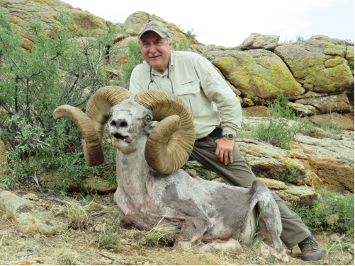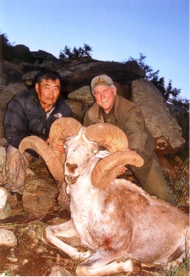 狩猎通常在清晨或傍晚通过驾车并使用望远镜寻找最佳公羊,发现目标后步行接近,射击距离通常约为300码。杭爱盘羊公羊平均角长约为48–52英寸,角基围约为18英寸。